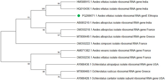The phylogenetic tree representing the Aedes vittatus ITS1 gene of the Ethiopian sequence is indicated with a green color. The evolutionary history was inferred using the neighbor-joining method [40]. The bootstrap consensus tree inferred from 500 replicates [41] and the percentage of replicate trees in which the associated taxa clustered together in the bootstrap test (500 replicates) are shown next to the branches [41]. The evolutionary distances were computed using Tamura–Kumar method [42]. This analysis involved 13 nucleotide sequences. All positions containing gaps and missing data were eliminated. There was a total of 554 positions in the final dataset. Evolutionary analyses were conducted in MEGA11 [43].