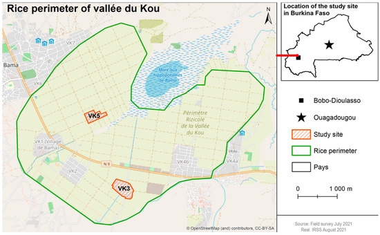 The study was carried out in Vallée du Kou, Burkina Faso (11°23′ N, 4°24′ W), in an irrigated rice field area. The site is characterized by wooded savannah across 1200 ha and contains seven discrete villages. Relatively high mosquito densities are observed annually during August and September, corresponding to the peak of the rainy season. Anopheles coluzzii is predominant throughout the year and An. gambiae is observed toward the end of the rainy season (frequencies fluctuating between 5% and 20%). Both species are highly resistant to pyrethroids and DDT (kdr frequency (0.8–0.95) [9,34,35,36]. Two villages, Vallée du Kou 3 (VK3) and Vallée du Kou 5 (VK5), were selected as intervention village (IV) and control village (CV), respectively (Figure 1).