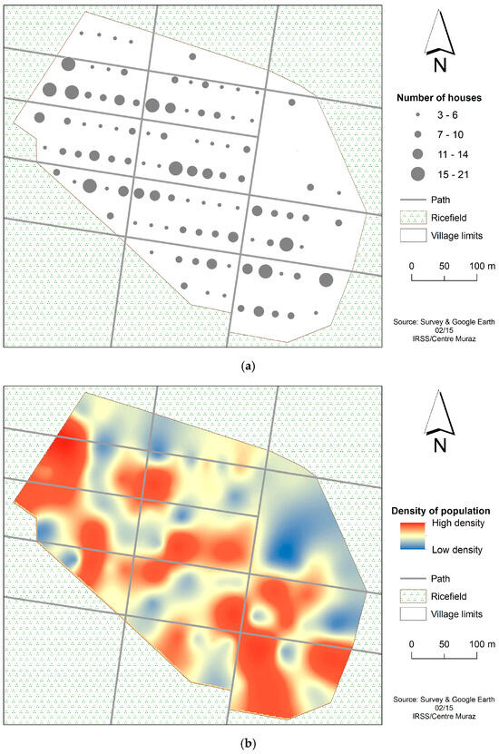 (a) Georeferencing of houses/windows distribution in VK3, (b) the human density related to the number of houses (from 3 up to 21). The number of houses ranged from 3 to 21. For an average of 5–10 people per house, the low-density population (blue) ranged from 15 to 30 persons, while the high-density population (red) may have up to 105–210 persons. A scale of 0–100 m was considered. The bigger the dots, the higher the population density. This is relative to the house density where the larger human population leaves.