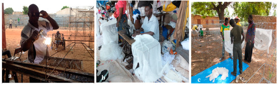 (a) Local window manufacturer, (b) tailor sewing traps, and (c) local field entomology workers recruited to install traps.