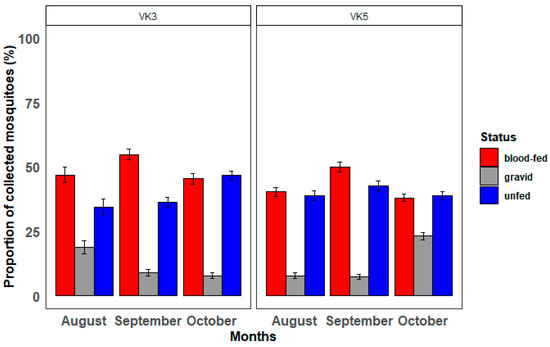 Proportion of collected indoor resting mosquitoes in Vallee du Kou (VK3 vs. VK5) per month (August, September, October) according to their feeding status (blood-fed, gravid, unfed).