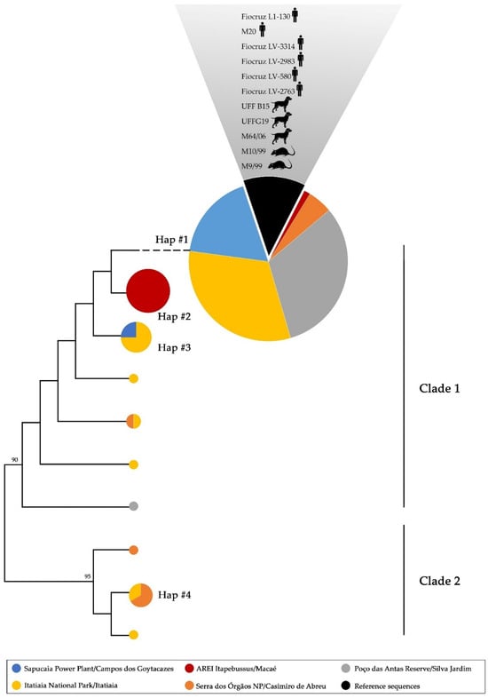 The Tamura Nei model (TN92) was the best DNA substitution model determined. Based on this, a high genetic identity was found among the sequences from the present study (TN92 = 0.01 ± 0.01; 99% identity). The phylogenetic analyses and haplotype network demonstrated the presence of four main haplogroups, Hap#1 (n = 68), Hap#2 (n = 9), Hap#3 (n = 5), and Hap#4 (n = 4), included in two main clades, with Hap#1, Hap#2, and Hap#3 included in clade 1 and Hap#4 included in clade 2 (Figure 2). This clade included only the sequences from Serra dos Órgãos National Park and Itatiaia National Park, while clade 1 included sequences from all studied sites. Hap#2 was formed exclusively by sequences from AREI Itapebussus. Seven haplotypes were identified as unique, not forming haplogroups (Table 1, Figure 2). There were no specific haplogroups formed according to hosts (Figure 2).