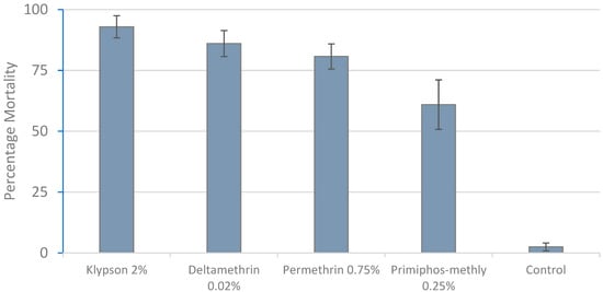 | Pirimiphos-methyl 0.25% | 82.08 (77.58–87.10) | 139.97 (131.99–149.17) |