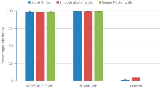 | Wall Type | Insecticide | 24 h | 48 h | 72 h | 96 h | 120 h | 144 h | 168 h |