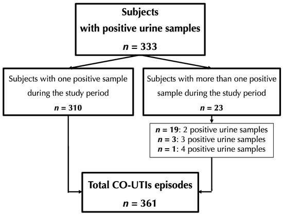 A total of 731 adults (median age of 41, IQR = 28; male–female ratio of approx. 1:4) experiencing symptoms of UTI were included in this study. Overall, 333 of them (45.6%) yielded one (n = 310) or more (n = 23) positive urine cultures that were considered consistent with the case definition, leading to a total of 361 episodes of CO-UTIs, with females accounting for the majority (85.3%) of cases (Figure 1). Among the 361 cases, 210 (58.2%) were classified as uUTIs (all in females), while the remaining 151 were classified as cUTIs, including 60 (39.7%) non-pregnant women, 38 (25.2%) pregnant women and 53 (35.1%) males (Table 1). The age distribution varied by gender, with the majority of male patients being 65 years or older (males ≥ 65, n = 30/53, 56.6%; females ≥ 65, n = 53/308, 17.2%; p < 0.05).