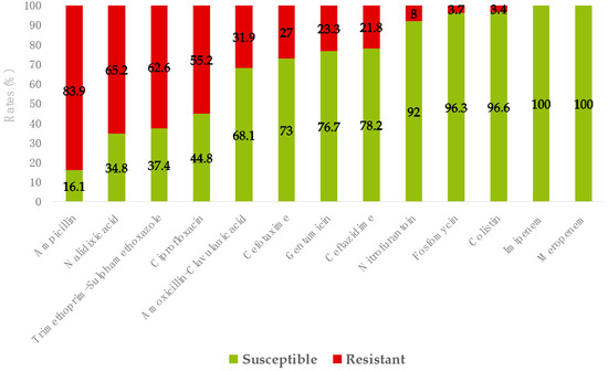 Considering E. coli, K. pneumoniae and P. mirabilis, which were the most common pathogens, very high resistance rates (>50%) were observed for ampicillin, trimethoprim–sulfamethoxazole, nalidixic acid and ciprofloxacin, and notably high resistance rates (>20%) were observed for amoxicillin–clavulanate, third generation cephalosporins and gentamicin, while a resistance rate <10% was observed for nitrofurantoin, and no resistance was observed for carbapenems (Figure 2). As for E. coli, resistance rates to fosfomycin and colistin, determined by reference methods, were 3.7% and 3.4%, respectively (Figure 2).