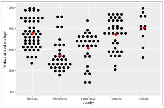 The percentage of weekdays with at least one login to the adherence platform per facility ranged from 42% in the Philippines to 76% in Ukraine (Table 3). It was 52% in South Africa, 68% in Tanzania, and 69% in Ethiopia (Figure 1). The mean number of minutes per facility per day spent on the platform was highest in Tanzania, at 18 min, and lowest in the Philippines, at 4 min.