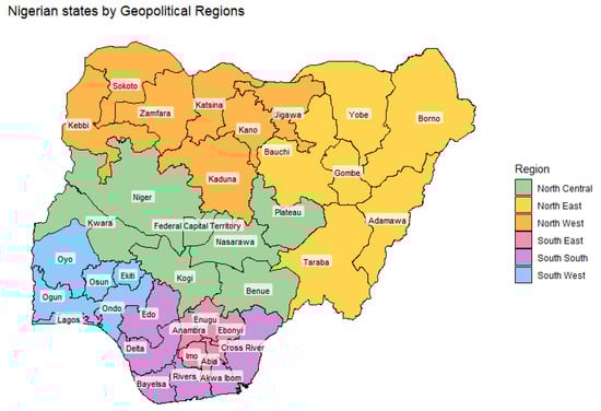 Map of Nigeria showing its states colour-coded by the six geopolitical regions.