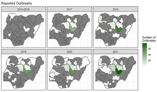 A panel of the spatial distribution of canine rabies outbreaks reported per state in Nigeria from 2014 to 2021. The data from 2014 to 2016 were combined due to the lack of reports in these years. States that did not report any outbreak are highlighted in grey.