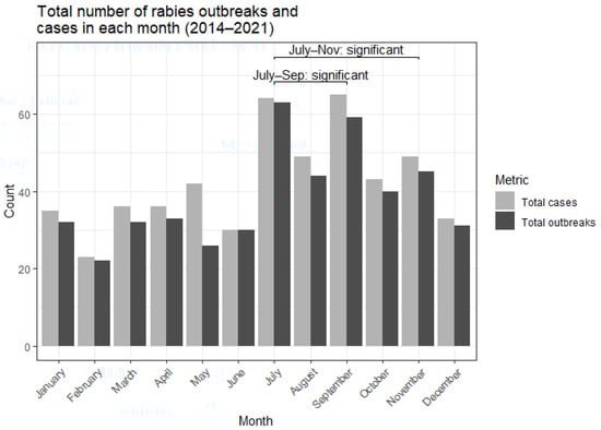 Compared to other times of the year, outbreaks were more frequently reported from July to September (Figure 3), corresponding to the rainy season in Nigeria. This temporal cluster of outbreaks was found to be statistically significant (Supplementary Table S2). This result aligns with previous studies based in Nigeria and Namibia that equally found an increase in reported rabies cases during the rainy season, which coincides with changes in dog ownership and dog behaviour [25,28,29]. In contrast, a retrospective study of dog bites and rabies cases in the Benue and Plateau states shows an increased number of dog bites and rabies cases in the dry season [30,31]. Due to these apparent conflicting results, further studies would need to be conducted to establish the temporal trends of rabies outbreaks in Nigeria. Collecting more granular data on factors such as age, sex, ownership status, and rural or urban environment would help clarify any seasonal patterns in dog mediated rabies transmission.