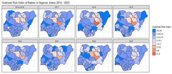 Maps illustrating the Outbreak Risk Index (ORI) for each state in Nigeria across all year ranges. These maps visualise the spatial and temporal variation in outbreak risk, highlighting regions with elevated or reduced risk based on the modelled relative risk and the observed case data. The ORI values reflect the calculated risk relative to the national average, with red shades indicating higher risk states and blue shades indicating lower risk stakes.