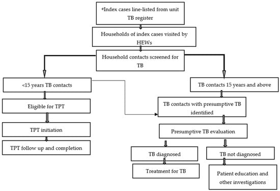 Evidence indicated several limitations associated with facility-based contact screening. Bringing asymptomatic contacts for screening to health facilities and additional cost implications for households pose difficulties to easily accessing contact screening and TPT service [8,9]. Community-based interventions could be a preferable approach to systematically address the challenges and barriers that limit the rural community’s access to and benefits of contact screening and TPT service. Other studies suggest an alternative hybrid approach that provides contact identification and screening in the community with subsequent TB investigations and TPT initiation and follow-up at the health facility [8,9].