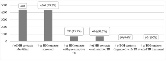 A total of 696 (15.9%) contacts were found to have symptoms of active TB, and 99.7% (694/696) of these were evaluated for TB per the national TB diagnostic algorithm. Sixty (8.6%) household contacts were diagnosed with active TB and initiated on TB treatment during the intervention period (Figure 2). Fifty-six active TB cases (93.3%) were detected among those household contacts aged 15 years and above, while four children <15 years accounted for 6.7% of the contacts diagnosed with active TB.