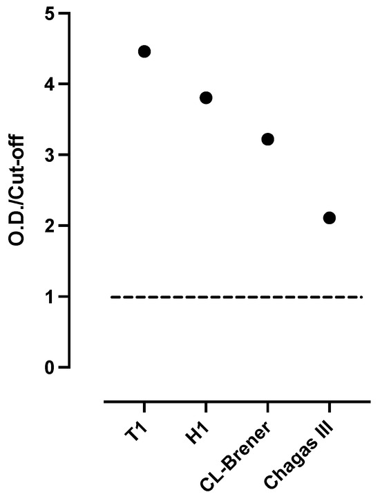 The serum sample was tested individually against each antigen in ELISAs. These protocols ensure both technical repeatability (triplicate wells) and biological repeatability (sample repetition on different days). The serum was diluted 1:100 in non-fat milk 1% in Phosphate-Buffered Saline (PBS)—tween 0.05% and incubated for 30 min at room temperature. After washing, goat anti-human IgG-HRP (Horseradish Peroxidase) (Sigma, St. Louis, MO, USA) was incubated for 30 min at room temperature. After a final wash, 3,3′,5,5′-tetramethylbenzidine (TMB) substrate solution (Immunochemistry, Hennepin, MN, USA.) was added and incubated at room temperature, protected from the light, and the reaction was stopped after 15 min with 1 M sulfuric acid (H2SO4) (Sigma-Aldrich, St. Louis, MO, USA). Absorbance was read on a microplate absorbance reader at 450 nm (Thermo Scan Thermofisher, Waltham, MA, USA). The cut-off OD (optical density) value for commercial ELISA tests was determined according to each manufacturer’s recommendations. For in-house ELISA tests, the cutoff point was defined as the mean OD of negative serum samples (n = 20) plus three standard deviations. In order to be able to compare the results of the different ELISA assays used, the results are presented as the resulting value of the optical density/cut-off line of each assay [25]. The Chagas III ELISA diagnostic kit (BiosChile, Santiago, Chile) was also used according to the supplier’s instructions.