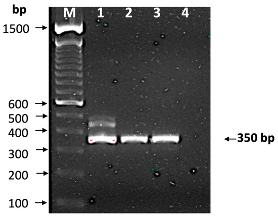 Identification of discrete typing unit. The mini-exon gene was amplified and observed in 2% agarose gel stained with ethidium bromide. Lane M, molecular markers (bp); lane 1, isolate T1; lane 2, isolate H1; lane 3, reactive sample from blood bank; and line 4, negative control. The arrow indicates a 350 bp amplification, which corresponds to TcI.