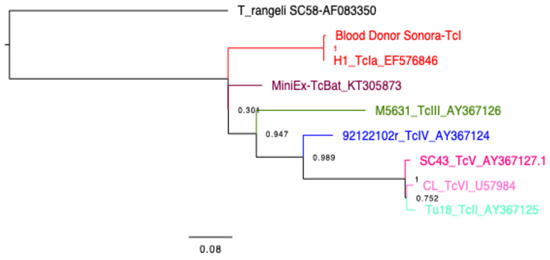 As previously reported, discrimination between the discrete typing units (DTUs) was performed using a Nested-PCR for the amplification of the mini-exon gene with the primers UTCC, TC, and TC2 [27]. The oligonucleotide sequences of the primers are UTCC-Fw: CGT ACC AAT ATA GTA CAG AAA CTG, TC2-Rv: CCT GCA GGC ACA CGT GTG TG and TC-Fw: CCC CCC TCC CAG GCC ACA CTG. For the primary PCR, the DNA sample was used as the template, UTCC-Fw and TC2-Rv were used for primers. For the secondary PCR, 1 µL of primary PCR product was used as the template, the primers were TC-Fw and TC2-Rv. Each PCR consisted of 30 cycles of denaturation at 94 °C for 30 s, annealing at 55 °C for 30 s, and final extension at 72 °C for 30 s, with an initial denaturation of 5 min at 94 °C and a final extension at 72 °C for 5 min. The PCR products were separated by electrophoresis (2% agarose). The expected product size is 300 base pairs for TcII-TcVI or 350 base pairs for TcI. Amplicon was purified for sequencing on MiSeq (Illumina San Diego, CA, USA) platform. Sequence files were imported in Geneious 11.0.2 software for analysis and mapped using T. cruzi reference sequences as previously described [28]. Phylogenetic analysis was performed using the approximately maximum likelihood method implemented in FastTree with 1000 bootstrap replicates to confirm DTU classification and relationship with reference sequences.