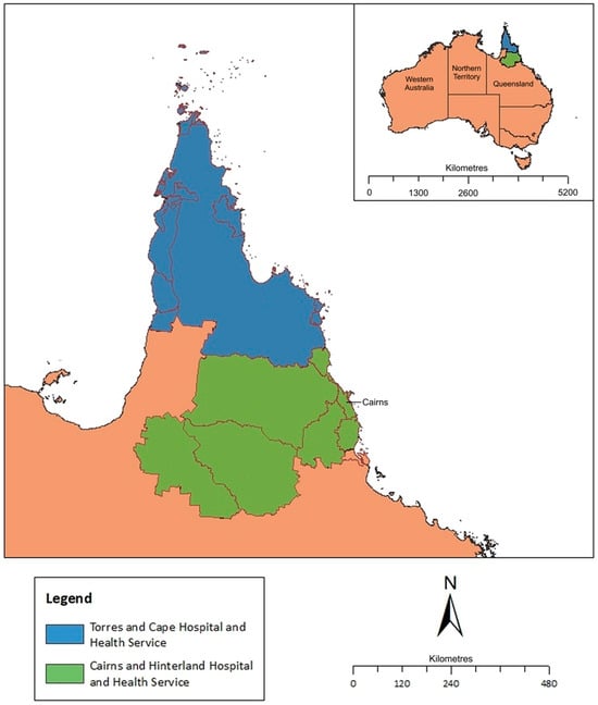 This retrospective study was performed at Cairns Hospital, the 581-bed tertiary referral hospital for the FNQ region of tropical Australia (Figure 1). The hospital serves a population of approximately 290,000 people who live across an area of 380,000 km2 [34]. There are two health services in the region, the Cairns and Hinterland Hospital and Health Service (CHHHS)—which serves the population of the administrative hub of Cairns and the surrounding region—and the Torres and Cape Hospital and Health Service (TCHHS), which serves the almost exclusively rural and remote population living on the Cape York Peninsula and the Torres Strait Islands.