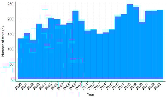 Number of annual skin scraping episodes collected over a 24-year period (1 January 2000 to 31 December 2023) in the public health system in tropical Far North Queensland, Australia.