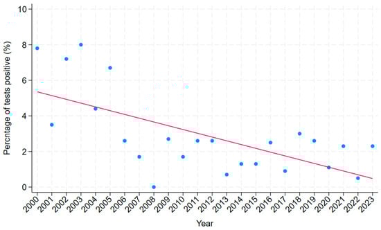 Percentage of skin scraping episodes that were positive for scabies collected over a 24-year period (1 January 2000 and 31 December 2023) in the public health system in tropical Far North Queensland, Australia (with line of best fit to highlight trend).