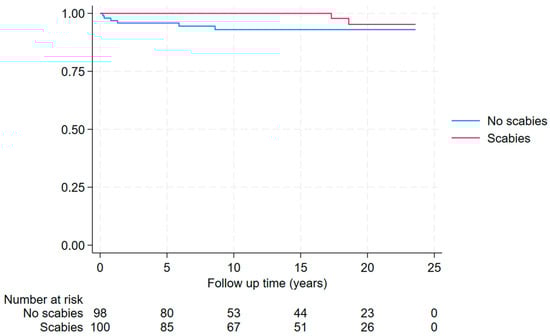 A list of the individuals that had a positive skin scraping for scabies between 2000 and 2023 was generated, and a corresponding list of controls (matched to age, sex, location, and First Nations Australian status) who tested negative was selected manually. The date that the scraping was performed was also matched (+/−2 years) to ensure that there was a similar duration of follow-up. ARF and RHD have been notifiable diseases in the state of Queensland since 1998 and 2018, respectively. The Queensland Rheumatic Heart Disease register was reviewed to determine if these individuals had been notified to the register for either ARF or RHD, and, if they had been, the date of their first notification. The individuals’ most recent formal estimated glomerular filtration rate (eGFR) was also identified through the AUSLAB system. CKD was defined as an eGFR < 60 mL/min/1.73 m2 [43]. Patients who had a diagnosis of ARF or RHD or a diagnosis of CKD preceding their skin scraping were excluded from the respective analyses.