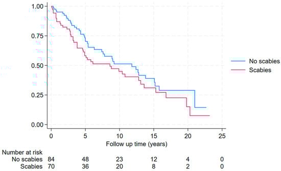 There were 168/202 (83%) individuals with skin scrapings who had an available eGFR; in 154/168 (92%) individuals, this was greater than 30 days after the skin scraping. Individuals who tested positive for scabies were not at an increased risk of having a GFR < 60 mL/min/1.73 m2 during follow-up than the matched controls (43/70 (61%) versus 40/84 (48%); HR (95% CI) 1.39 (0.90–2.14), p = 0.13) (Figure 5 and Supplementary Figure S3).