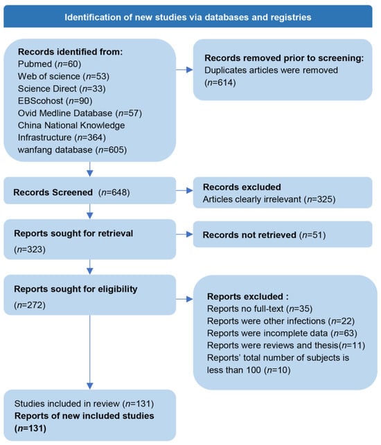 By searching the literature database, we obtained a total of 1262 publications (293 in English, 969 in Chinese), 272 of which remained after removing the duplicate studies and a preliminary screening. Thirty-five of these articles did not have full text; 22 articles covered vaginal infections in animals; 63 articles had incomplete data; 11 articles were retrospective; and the total number of subjects in 10 articles was less than 100. After full-text review, 131 studies focusing on T. vaginalis were ultimately included based on the stringent inclusion criteria (Figure 1) [15,16,17,18,19,20,21,22,23,24,25,26,27,28,29,30,31,32,33,34,35,36,37,38,39,40,41,42,43,44,45,46,47,48,49,50,51,52,53,54,55,56,57,58,59,60,61,62,63,64,65,66,67,68,69,70,71,72,73,74,75,76,77,78,79,80,81,82,83,84,85,86,87,88,89,90,91,92,93,94,95,96,97,98,99,100,101,102,103,104,105,106,107,108,109,110,111,112,113,114,115,116,117,118,119,120,121,122,123,124,125,126,127,128,129,130,131,132,133,134,135,136,137,138,139,140,141,142,143,144,145]. Basic information about the included studies is presented in Supplementary Table S1, and they were classified into four categories according to the subject population types: general women (37 articles), hospital gynecological outpatient patients (84 articles), pregnant women (4 articles), sex workers and sex offenders (6 articles). The quality assessment revealed that 21 (15.67%) articles were of high quality (≥35), 103 (76.87%) articles were of moderate quality (≥17.5~35), and 10 (7.46%) articles were of low quality (<17.5).