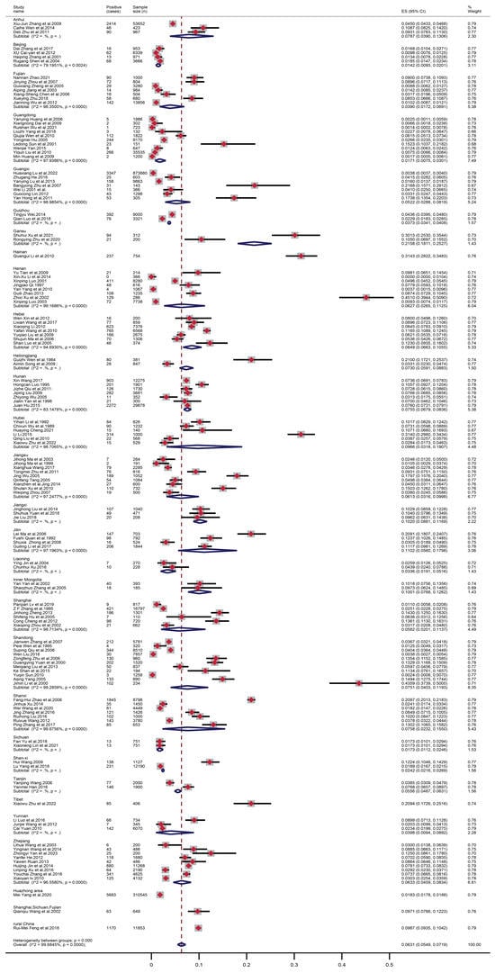 From 1984 to 20 June 2024, a total of 1,593,706 Chinese women were examined regarding TV infection, resulting in a calculated combined prevalence of 6.31%, which was estimated with random effects (I2 = 99.68%) (Figure 2). We used the Standard Map Service (http://bzdt.ch.mnr.gov.cn/, (accessed on 18 April 2025)) to generate a map that depicts the prevalence of TV in each province of China, based on the included studies (Figure 3). Among the provinces, most examinations were conducted among women in Shandong and Guangdong, with 11 (7.51%) and 10 (1.71%) studies, respectively. The highest prevalence rate was in Henan (45.10%) [134]. Second, patients from the hospital’s gynecological department had a high prevalence rate in Shandong [144], Hainan (n = 1) [86], Hubei (n = 3) [74] and Gansu (n = 2) [55], with 43.59%, 31.43%, 31.40% and 30.13%, respectively. The lowest prevalences were reported from Beijing (1.42%), Guangdong (1.71%) and Sichuan (1.73%).
