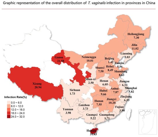 Graphic representation of the overall distribution of T. vaginalis infection in provinces in China. The T. vaginalis infection rate is shown in different colors.