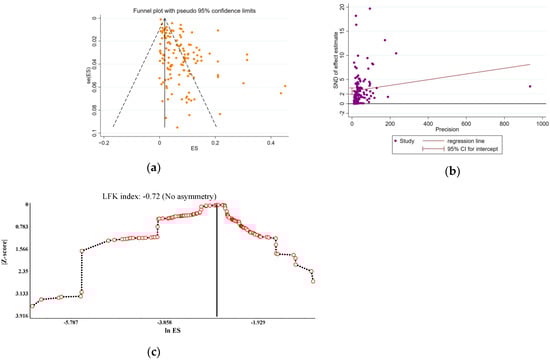 (a) Funnel plot and (b) Egger’s test plot were utilized to evaluate the publication bias within the current study. The colored circles stand for each individual study, the middle line indicates the effect size, while the other two lines represent the corresponding confidence ranges. (c) Doi plot for the prevalence of TV infection among the female population of China. A Luis Furuya-Kanamori (LFK) index of 0.72 indicates major asymmetry.