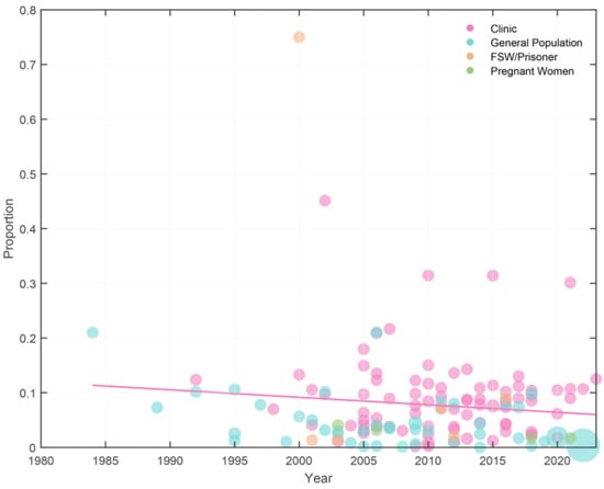 A meta-regression graph regarding the prevalence of trichomoniasis among Chinese female population in accordance with the year of publication: the pink line is the regression line, which was plotted based on the intercept and the slope of the regression model. The bubbles of different colors symbolize the type of population, and their sizes denote the effect size of each study.