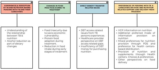 Twenty-eight preliminary codes were created from the transcripts of 16 FGDs. These codes were further classified into sub-themes and major themes. The themes were as follows: (a) the experiences and perceptions of TB and nutrition among persons with TB and their caregivers; (b) changes in food practices during TB treatment; (c) issues related to Direct Benefit Transfer; and (d) the preferences of TB patients and their caregivers regarding nutritional support and service delivery (Figure 1 and Figure 2).