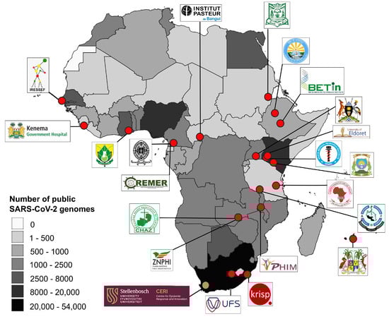 Map of Africa depicting the location and affiliation of the fellows who participated in the training (red circles). The location of CERI, where the training was hosted, is shown with a gold circle. Country colour displays the number of SARS-CoV-2 genomes publicly available on the Global Initiative on Sharing All Influenza Data (GISAID) as a proxy for pathogen genomic sequencing capacity (data accessed on 17 July 2023). Map produced with Quantum GIS [12].