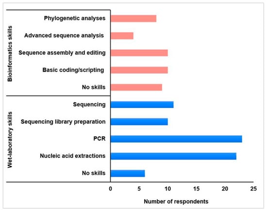 Before attending the training, our skill levels in wet-laboratory protocols and bioinformatics abilities (Figure 2) were rated. CERI used this in the selection process not only to identify fellows who would benefit from the training, but also to include individuals with some pre-existing skills so that fellows may learn from one another. We mostly reported having expertise in the wet laboratory, particularly in nucleic acid extractions and polymerase chain reaction methods (~80%). Approximately 60% required training on library preparation and sequencing methods, while our greatest need for upskilling was in bioinformatics and phylogenetic analyses.