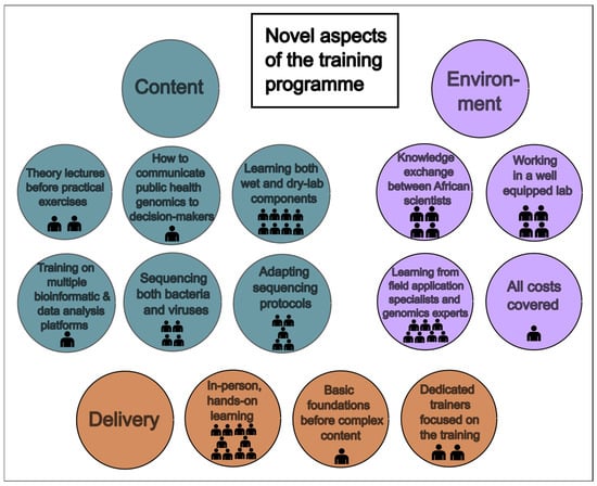 Bearing in mind that, before this training, 14% of us had not attended formal training opportunities in genomics or bioinformatics, while 63% had some form of formal training (not including self-learning), we identified key aspects of this training event that were new or different from previous training we had attended (Figure 3). We believe other educational initiatives should try to replicate these aspects. We identified the in-person and hands-on learning opportunity, of both the wet- and dry-lab components of pathogen sequencing, from genomics experts and field application specialists as the most impactful approaches of this training event. One of the fellows provided this response to our anonymous questionnaire: “This training stood out from previous experiences in several ways, offering a balanced mix of wet-lab and dry-lab sessions, fostering a holistic understanding of genomics. This integration of hands-on experiments with bioinformatics analysis offered a comprehensive approach. The training environment promoted collaboration, allowing participants to apply theoretical knowledge in practical scenarios. This approach not only deepened understanding but also facilitated networking and knowledge exchange among participants. Overall, the unique combination of practical skills, interactive learning, and a collaborative environment made this training exceptionally effective. Other initiatives should consider replicating this blend to enhance engagement, practical application, and knowledge transfer”.