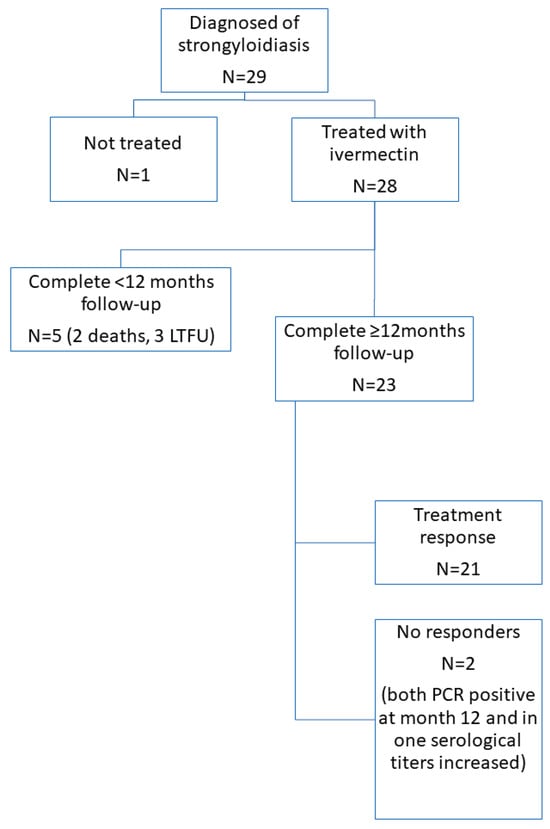 Patients were followed up to evaluate clinical response (presence of symptoms compatible with strongyloidiasis), hematological response, and parasitological response. Assessments were performed at 3, 6, 12, and 18 months post-treatment. At each visit, serum and stool samples were collected from every patient for the following assessments: complete blood count (CBC), IgE measurement, Strongyloides serology, coproparasitological examination, Strongyloides culture, and DNA detection by real-time polymerase chain reaction (RT-PCR) from a fresh stool sample. In our clinical practice, follow-up is carried out with CBC and Strongyloides serology, with Strongyloides culture and coproprasitological examination being added if they were positive at baseline. IgE, Strongyloides RT-PCR and systematic coproparasitological and Strongyloides culture were added for research purposes. A minimum follow-up period of 12 months was required to evaluate treatment outcomes.