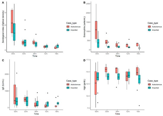(A) Evolution of the serological index over time, (B) evolution of the eosinophil count over time, (C) evolution of Immunoglobulin E levels over time, and (D) evolution of hemoglobin levels over time. (Dots are outliers).