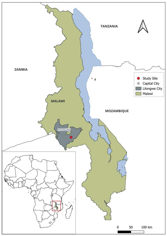 Situated in the southeastern region of Africa, Malawi is a landlocked country sharing borders with Mozambique, Tanzania, and Zambia. Data were collected within Lilongwe, the capital city, in February 2023. RNA samples were taken from wildlife, specifically insectivorous bats. Further, knowledge, attitude, and practices data were obtained through a semi-structured questionnaire in a rural community within Lilongwe situated at 14°08′ S, 33°51′ E (Figure 1). At the centre of this rural dwelling area is Ngala Hill, a notable landmark and tourist destination that serves as a habitat for a bat colony. The surrounding landscape consists of a small village, farmlands, and scattered homesteads, primarily inhabited by smallholder farmers who rely on crops, livestock, and some hunting for their livelihoods.
