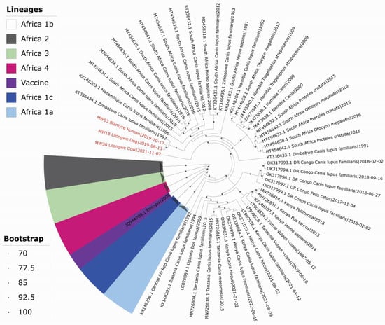 - Kainga, H.; Chatanga, E.; Phonera, M.C.; Kothowa, J.P.; Dzimbiri, P.; Kamwendo, G.; Mulavu, M.; Khumalo, C.S.; Changula, K.; Chambaro, H.; et al. Current status and molecular epidemiology of rabies virus from different hosts and regions in Malawi. Arch. Virol. 2023, 168, 61. [Google Scholar] [CrossRef]