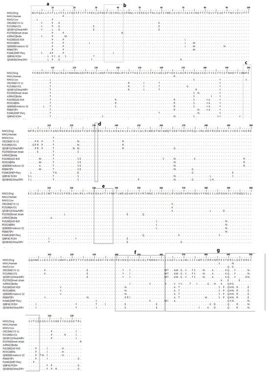 Multiple sequence alignment of the G amino acid sequence. (a): Signal peptide, (b,c): antigenic site II, (d,e): antigenic site I and III, (f,g): transmembrane and cytoplasmic domain.