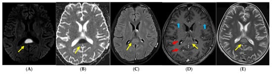 - Starkey, J.; Kobayashi, N.; Numaguchi, Y.; Moritani, T. Cytotoxic Lesions of the Corpus Callosum That Show Restricted Diffusion: Mechanisms, Causes, and Manifestations. Radiographics 2017, 37, 562–576. [Google Scholar] [PubMed]