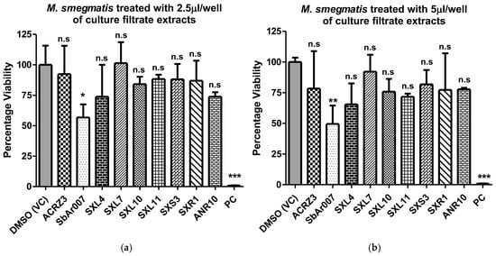 Preliminary MTT assays on M. smegmatis with culture filtrate extracts from nine different isolates. M. smegmatis was treated with culture filtrate extracts for 24 h, and viability assays were performed. The bar plots represent the percentage viability of M. smegmatis treated with (a) 2.5 µL and (b) 5 µL per well of culture filtrate extracts isolated from the isolates. PC: positive control (hygromycin, 50 µg/mL); VC: vehicle control. One-way ANOVA (Dunnet’s multiple comparison test) was performed, and the error bars represent the standard deviation. “***” denotes p ≤ 0.001, “**” denotes a p ≤ 0.01, “*” denotes p ≤ 0.05. n.s: statistically non-significant.