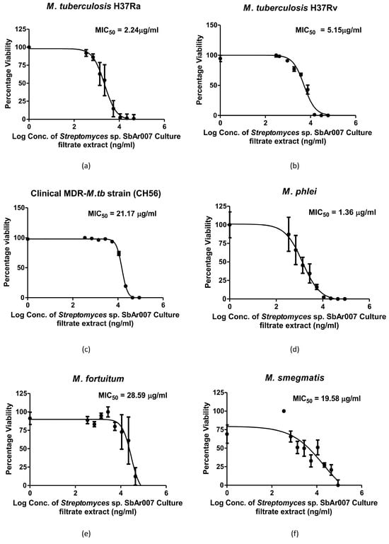 Microdilution assays for determining MIC50. Dose–response curves were plotted upon treatment with Streptomyces sp. SbAr007 culture filtrate extract against (a) M. tuberculosis H37Ra, (b) M. tuberculosis H37Rv, (c) a representative clinical MDR-M. tuberculosis strain (CH56) (resistant to established anti-TB drugs, i.e., isoniazid and rifampicin), (d) M. phlei, (e) M. fortuitum, and (f) M. smegmatis. All the experiments were performed at least thrice, and the error bars represent the standard deviation.