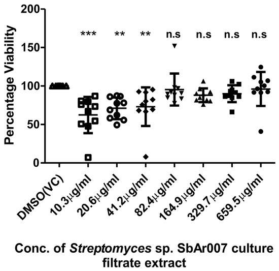 Cytotoxicity of Streptomyces sp. SbAr007 culture filtrate extract on isolated hPBMCs in a dose-dependent treatment. VC: vehicle control. One-way ANOVA (Dunnett’s multiple comparison test) was performed, and error bars represent the standard deviation; “***” denotes a p-value of < 0.001, “**” denotes p-value of <0.01, “n.s” denotes p-value > 0.05, and n = 10.