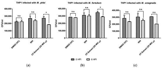 Intracellular clearance of NTMs—(a) M. phlei, (b) M. fortuitum, (c) M. smegmatis—in THP-1 macrophages determined via CFU enumeration. The concentration (1.72, 56, and 40 µg/mL) of culture filtrate (CF) extracts were twice the determined MIC50 in M. phlei, M. fortuitum, and M. smegmatis, respectively, and isoniazid (INH) was used as drug control. HPI, hours post infection; VC: vehicle control. Two-way ANOVA (Dunnett’s multiple comparison test) was performed, and the error bars represent the standard deviation; “*” denotes a p-value of <0.05, and “n.s” denotes a non-significant p-value of > 0.05.