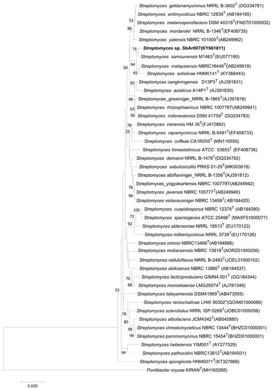 Neighbor-joining phylogenetic tree of Streptomyces sp. SbAr007 was generated using the NGPhylogeny.fr open website [39,40] based on the 16S rRNA gene sequence.