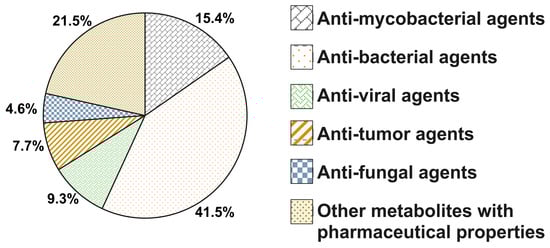 LC-MS data were subjected to analysis through the MZmine database, as described in material and methods section. Metabolites were identified and listed using m/z values from HMDB/KEGG databases. Upon obtaining the list, we focused on known chemical entities. It was intriguing to notice a spectrum of known antibiotics and other metabolites with pharmaceutical properties in the extracts. We categorized the known chemical entities into anti-mycobacterial, anti-bacterial, anti-fungal, anti-HIV, anti-cancer, and other metabolites with pharmaceutical properties (Figure 6). Table S3 (Supplementary Materials) enlists these metabolites. Some of the identified metabolites belonging to anti-mycobacterial compounds are norfloxacin [44,45], puromycin [44], levofloxacin [46], sparfloxacin [47], tetracycline [48], gentamicin [49,50], kanamycin A [51], microcystin-LR [52], liposidomycin B [53], and moxifloxacin [54].