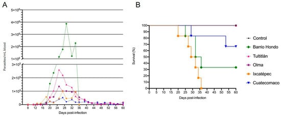 - Flores-Villegas, A.L.; Jiménez-Cortés, J.G.; González, J.; Moreno-Rodríguez, A.; Pérez-Cabeza de Vaca, R.; Segal-Kischinevzky, C.; Bucio-Torres, M.I.; De Fuentes-Vicente, J.A.; Nava-Lazaro, E.; Salazar-Schettino, P.M.; et al. Parasitemia and Differential Tissue Tropism in Mice Infected with Trypanosoma cruzi Isolates Obtained from Meccus phyllosoma in the State of Oaxaca, Mexico. Pathogens 2022, 11, 1141. [Google Scholar] [CrossRef]