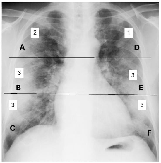 The severity of lung involvement was assessed using the Brixia scoring system, which quantifies radiological lung damage in COVID-19 infection. This algorithm divides the lungs into six regions, each evaluated individually and assigned a score from 0 to 3 based on the severity of the observed lesions. The total score is obtained by summing the scores from all regions, providing a clear overall assessment of lung involvement [14,15]. The total Brixia score ranges from 0 (indicating no pleural or pulmonary vascular changes) to 18 (reflecting the most severe lung involvement) (Figure 1). Other radiological abnormalities, such as pleural effusions, are not included in the Brixia score and were therefore not considered in the assessment of pulmonary severity [16].