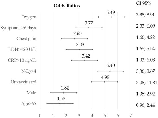 Forest plot illustrating the odds ratios and 95% confidence intervals from multivariate logistic regression to identify the relationship between a Brixia score over 5 and other predictors of unfavorable COVID-19 outcomes: unvaccinated, late presentation after 6 days from the onset, necessity of oxygen supply, increased CRP (>10 ng/dL), LDH > 450 U/L, and NLR over 4; level of significance p < 0.01, two-tailed.