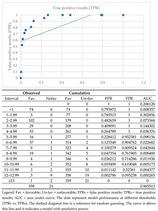 The analysis of the Brixia score as a prognostic marker for COVID-19 progression, based on the AUC calculation, indicated a value of 0.96, demonstrating a high overall performance of this test in identifying cases with an unfavorable outcome (Figure 3 with additional table).